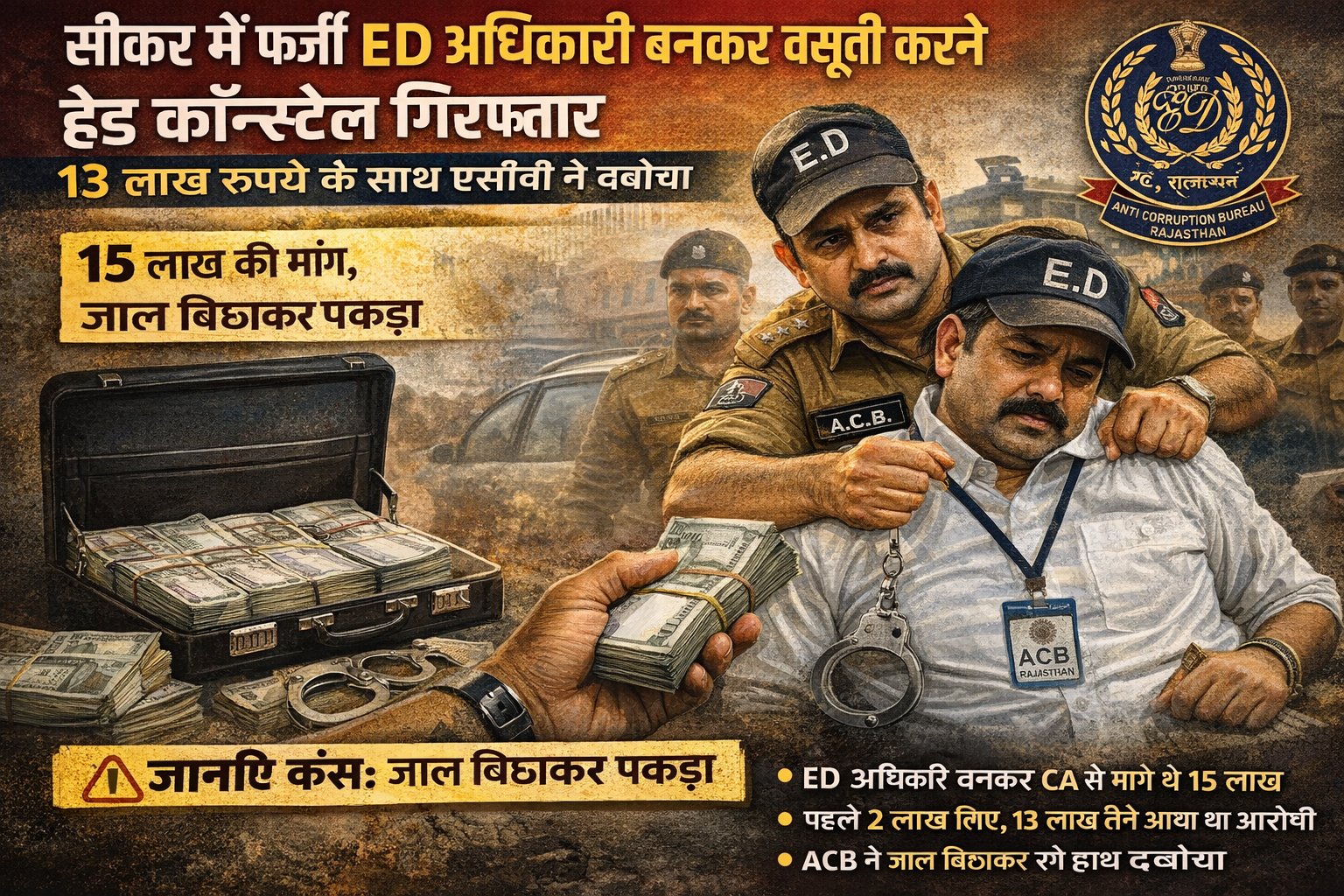 सीकर में फर्जी ED अधिकारी बनकर वसूली करने वाला हेड कॉन्स्टेबल गिरफ्तार, 13 लाख रुपये के साथ एसीबी ने दबोचा…