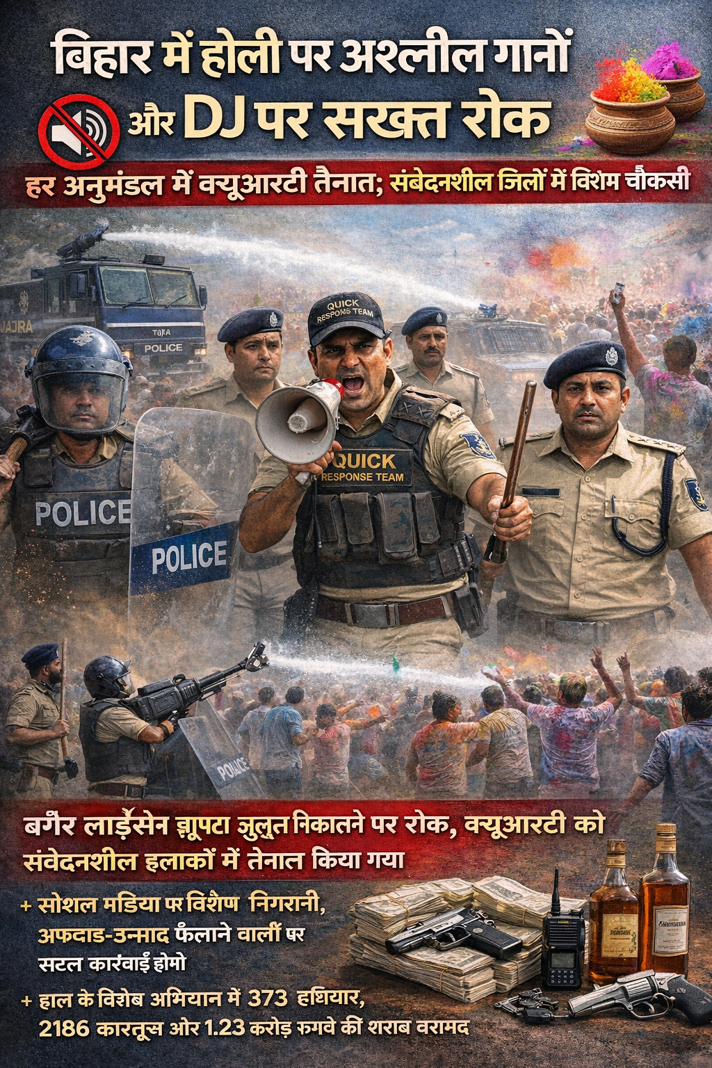 बिहार में होली पर अश्लील गानों और तेज डीजे पर सख्त रोक, हर अनुमंडल में क्यूआरटी तैनात; संवेदनशील जिलों में…