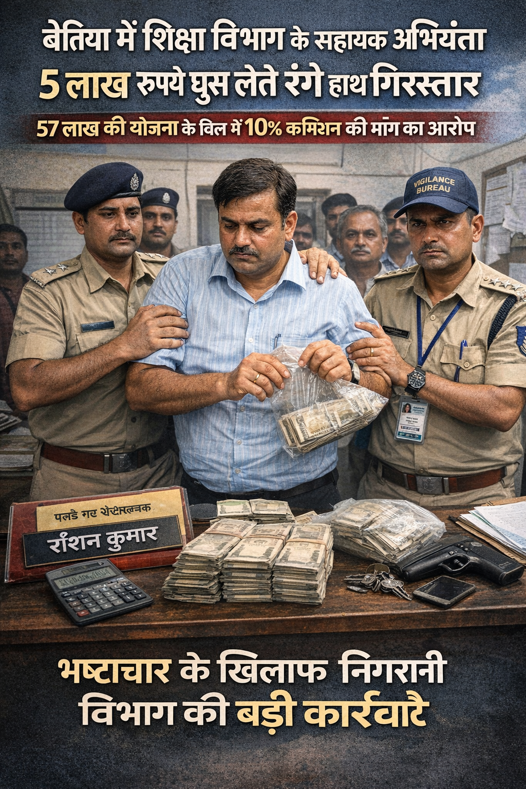 बेतिया में शिक्षा विभाग के सहायक अभियंता 5 लाख रुपये घूस लेते रंगे हाथ गिरफ्तार, 57 लाख की योजना के…